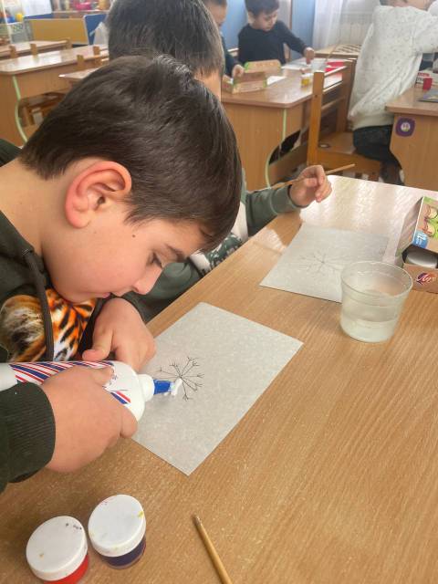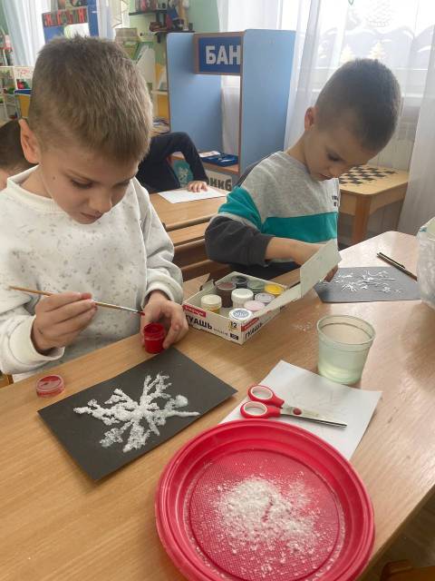 В подготовительной группе «Неваляшки» прошло необычное занятие на котором ребят познакомила с увлекательной нетрадиционной техникой — рисованием солью воспитатель Елизавета Эдуардовна. Темой для творческих экспериментов стали ажурные снежинки. Процесс настолько захватил наших художников, что они, затаив дыхание, наблюдали за тем, как их снежинки на глазах оживают и окрашиваются. Эта техника уникальна тем, что соединяет в себе элементы эксперимента и творчества, развивая любознательность, терпение и воображение. Техника рисования солью покорила сердца наших мальчишек из подготовительной группы «Неваляшки» и обязательно займет достойное место в нашей творческой мастерской.