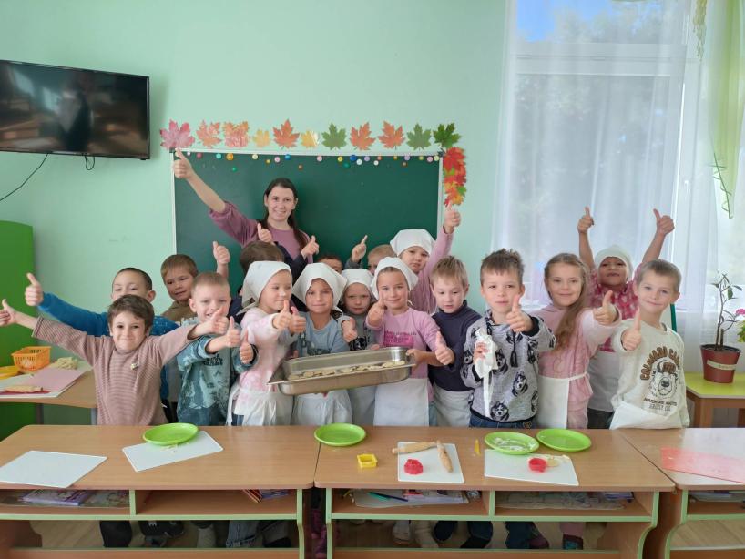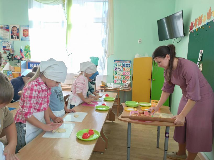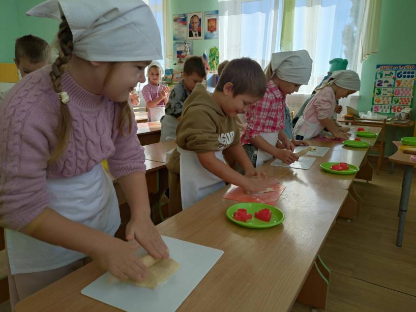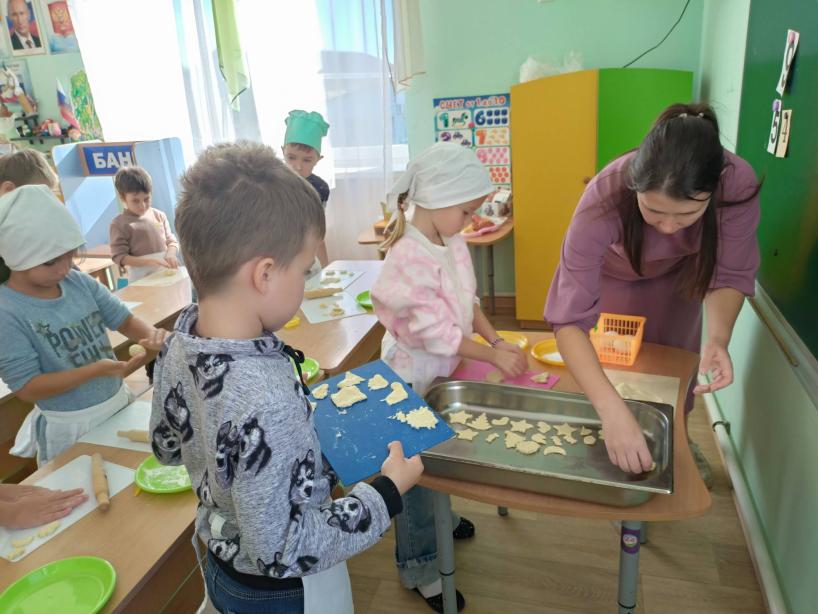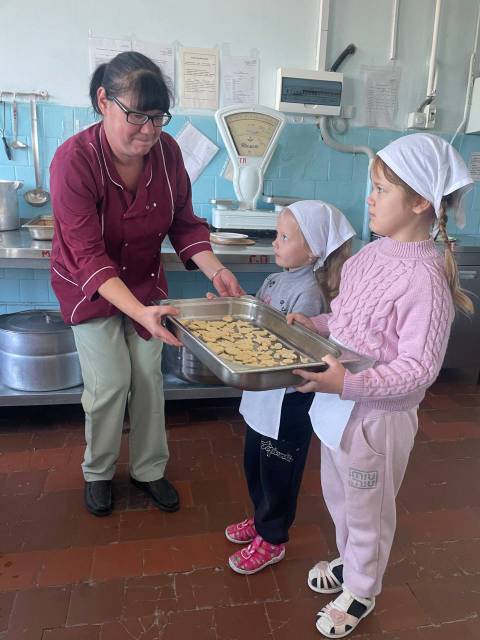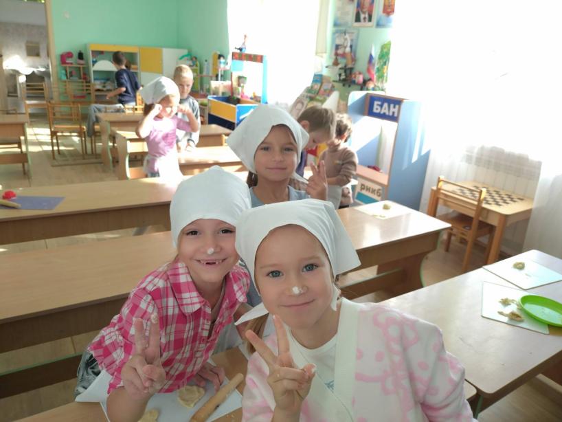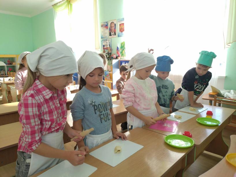 Наши дети очень старались, чтобы получились аккуратные и красивые заготовки. Когда противень был заполнен, его отнесли на кухню, чтобы повара поставили в горячую духовку.