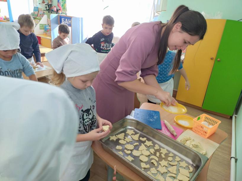 Елизавета Эдуардовна показала ребятам, как правильно раскатать тесто и вырезать специальными формочками фигурки будущего печенья.